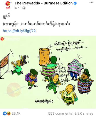 မသိရင္ မင္းေအာင္လိႈင္ရဲ ႔စားေသာက္ကုန္စက္ရံုကထုတ္တဲ့                                                                          ေလ ွ်ာက္သီးေဆးျပားထုပ္ေတြကို                                                                                                                  စစ္သားေတြက ႀကံဳသလို လိုက္ေရာင္းေပးေနၾကတာပဲလို႔ထင္ၾကမွာ။